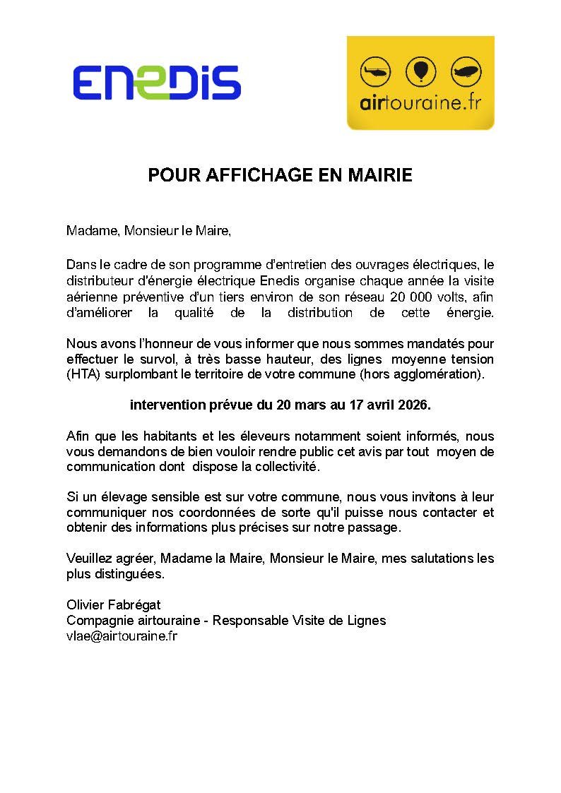 Nous avons l’honneur de vous informer du survol, à très basse hauteur, des lignes surplombant le territoire de votre commune (hors agglomération), du 20 mars au 17 avril 2026.