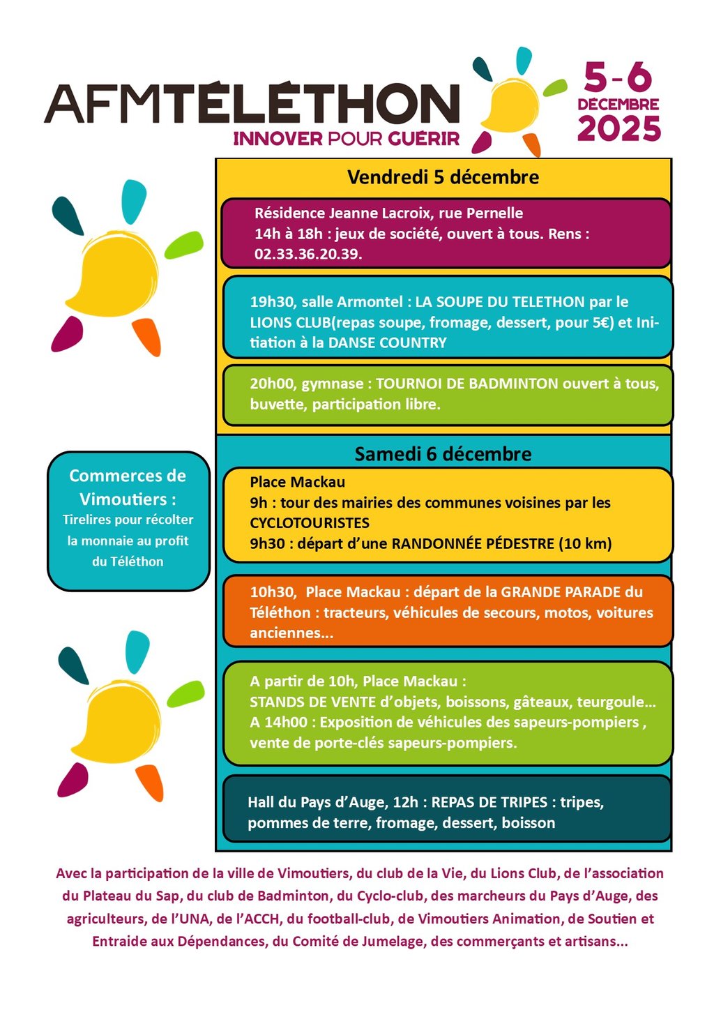 Les festivités continuent ce samedi 6 décembre avec du cyclotourisme, une randonnée pédestre, à boire, à manger et à acheter sur les stands, sans oublier la parade du Téléthon dans la matinée, pour faire du bruit et rappeler aux habitants que les malades ont besoin de nous, et le traditionnel repas de tripes sous le hall du Pays d'Auge.