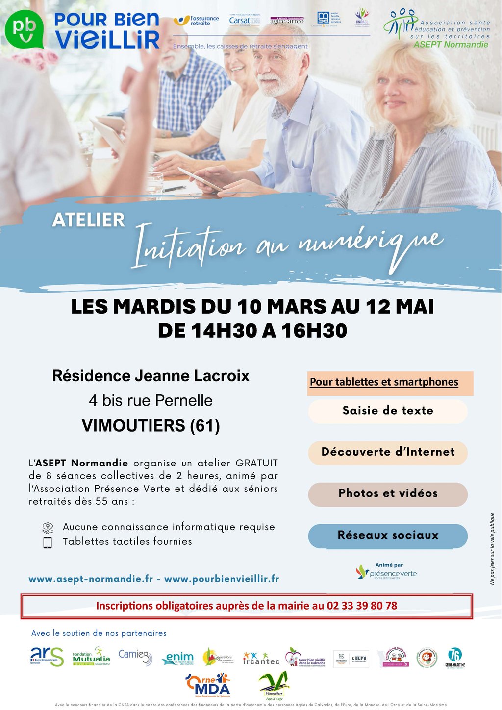 L'ASEPT NORMANDIE organise un atelier gratuit de 8 séances collectives de 2 heures, animé par l'association Présence Verte et dédié aux séniors dès 55 ans. Ces ateliers se dérouleront à la Résidence Jeanne Lacroix - 4 bis rue Pernelle à Vimoutiers.