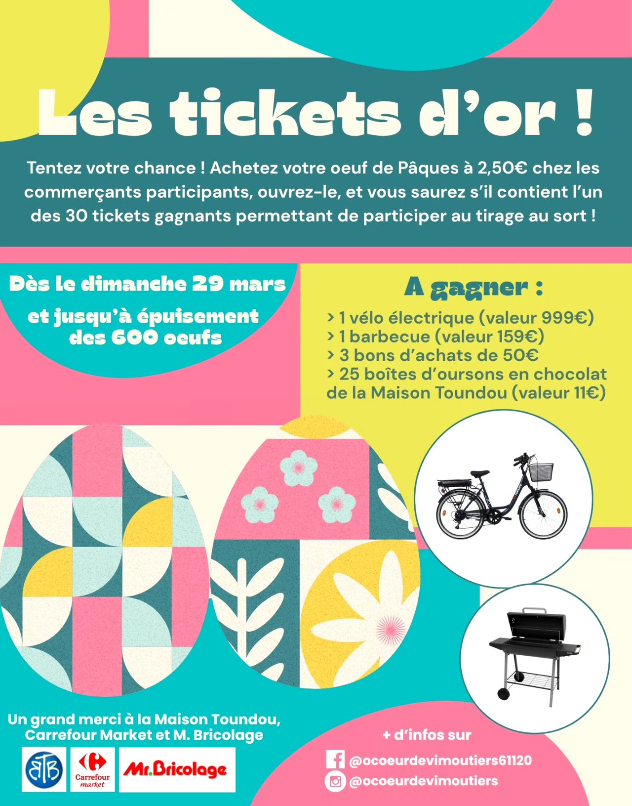 Rendez-vous chez l'un des 20 commerçants participants pour acheter votre Oeuf de Pâques en chocolat, et tentez de gagner l'un des beaux cadeaux en jeu : vélo électrique, barbecue, bons d'achat, œufs en chocolat...